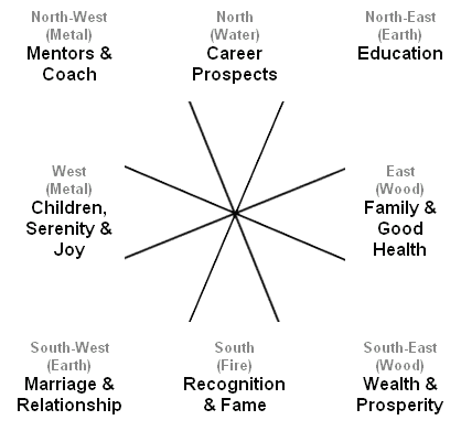 It is also commonly known as the Eight Aspirations or Life Aspirations. Each direction is associated with an aspect of life. For example, south-west is the marriage & relationships location based on the static Bagua directions. You can activate each of the associations by establishing which rooms corresponds to which association.